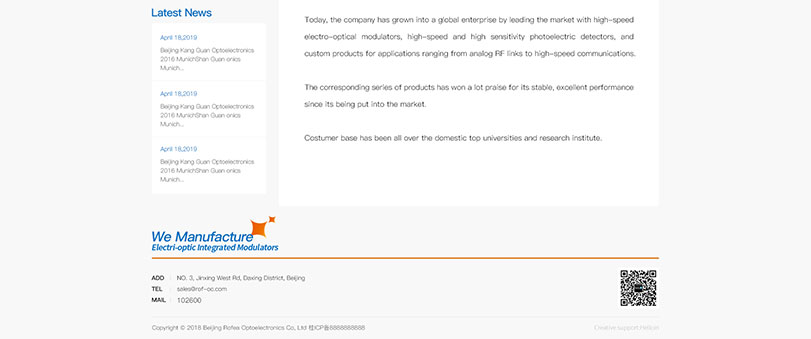 Rofea十年来一直致力于创新光纤无线电(ROF),光通信和传感技术。 如今,该公司已凭借高速电光调制器,高速和高灵敏度光电检测器以及适用于从模拟RF链路到高速通信的各种应用的定制产品,在市场上处于领先地位,已发展成为一家全球企业。 自投放市场以来,相应系列的产品以其稳定,优异的性能赢得了广泛赞誉。 服装基地已遍布国内顶尖大学和研究所。