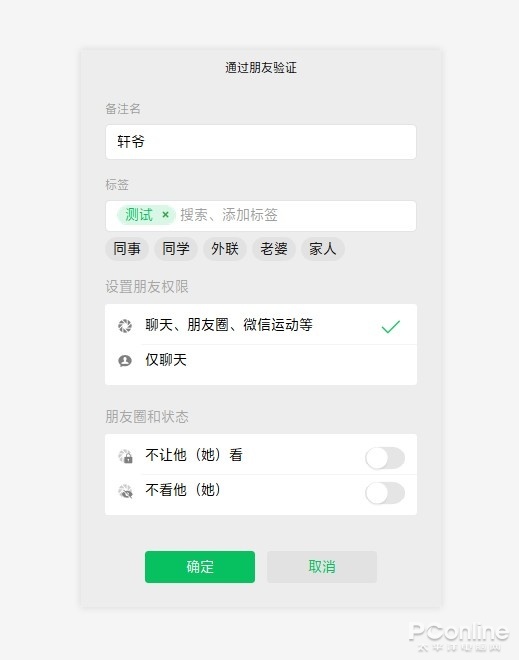 好友验证面板也和之前有所区别,增加了标签及权限设置选项。除了能够更精准地控制新用户权限外,也方便对新好友操作分组。此外“仅聊天”和“不(让)他看”也是两项比较常用的功能,在使用方法上与手机版无异。